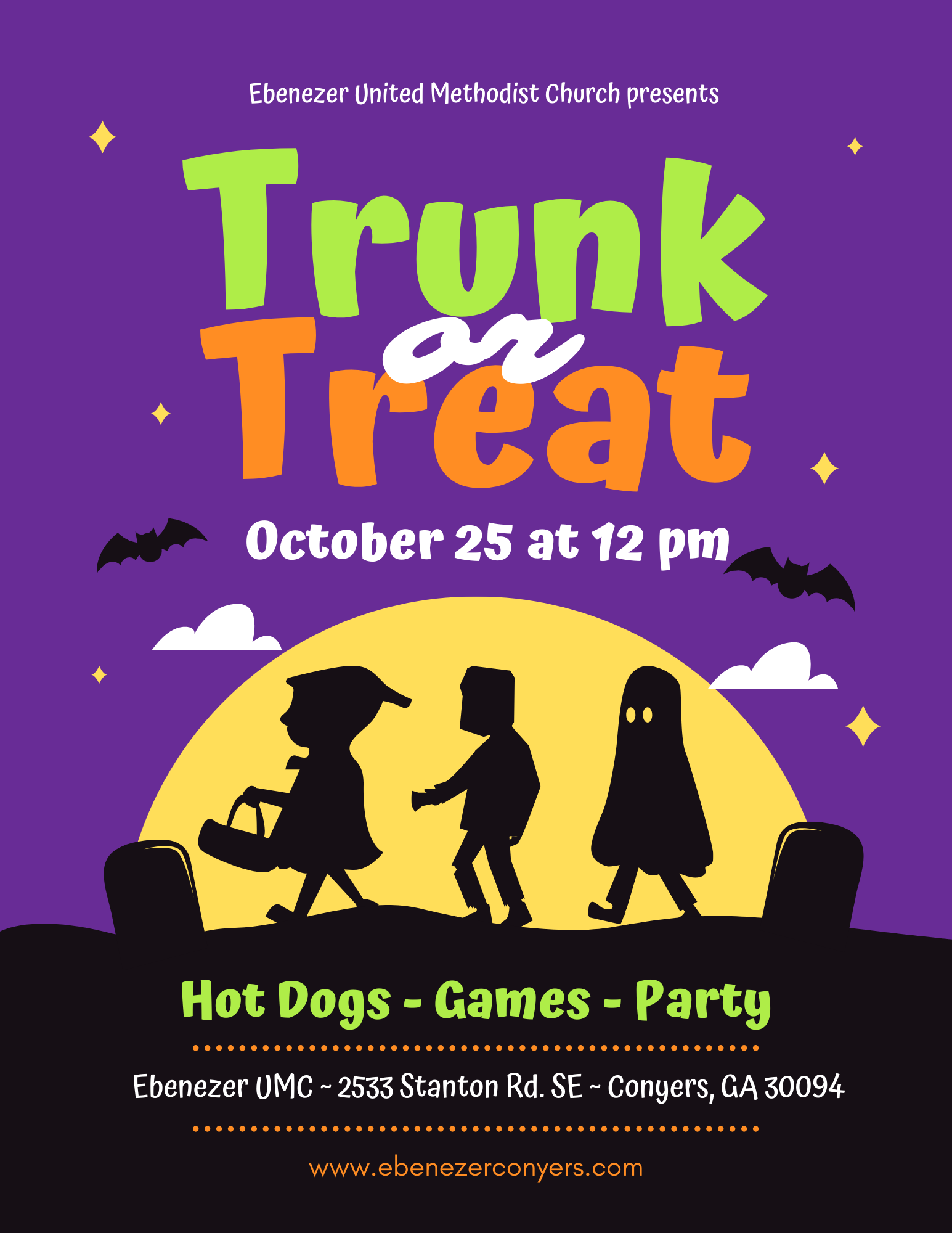 Join us at 12 pm on Saturday, October 25th for some family-sized fall fun at our Fall Festival that includes a Trunk or Treat! Wear your costumes and bring a bag/bucket to go from car to car collecting candy and treats. There will be hot dogs and plenty of games. It’s going to be an unforgettable afternoon of fun, family, and community spirit. Mark your calendars and bring your family and friends to this exciting event. We can’t wait to see you there!